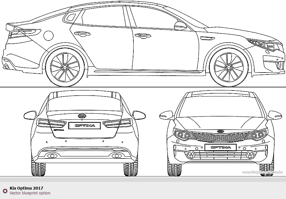 Raster blueprint of the 2017 KIA Optima Tag. This free downloadable image can be used for graphic projects, digital design, and 3D modeling. The file provides accurate exterior proportions of the vehicle. Model year: 2017. Body type: Tag.