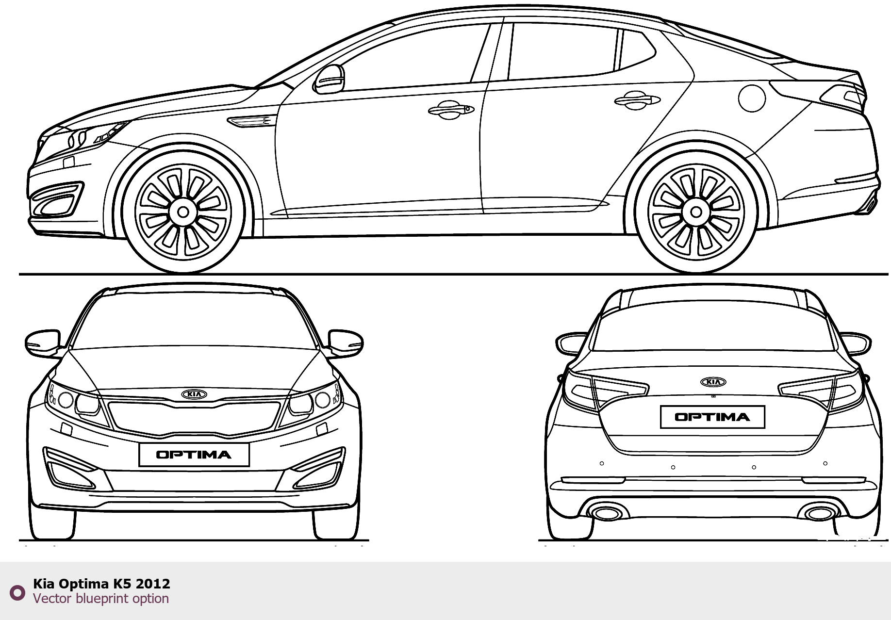 Raster blueprint of the 2012 KIA Optima K5 Tag. This free downloadable image can be used for graphic projects, digital design, and 3D modeling. The file provides accurate exterior proportions of the vehicle. Model year: 2012. Body type: Tag.