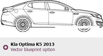 Raster blueprint of the 2013 KIA Optima K5 Tag. This free downloadable image can be used for graphic projects, digital design, and 3D modeling. The file provides accurate exterior proportions of the vehicle. Model year: 2013. Body type: Tag.