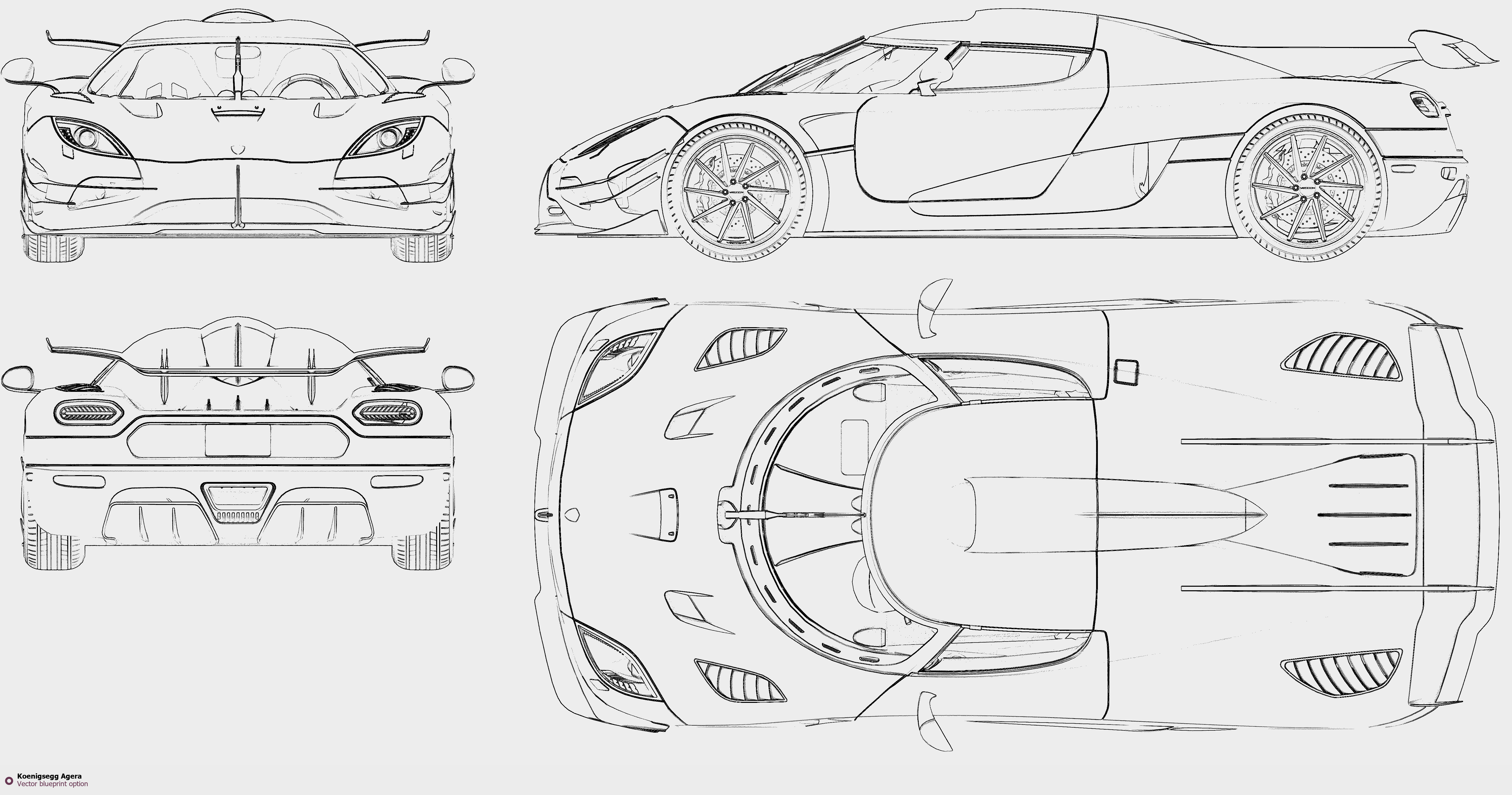 Raster blueprint of the Koenigsegg Agera Coupe. This free downloadable image can be used for graphic projects, digital design, and 3D modeling. The file provides accurate exterior proportions of the vehicle. Body type: Coupe.