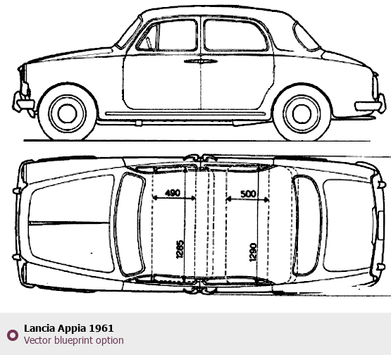 Raster blueprint of the 1961 Lancia Appia Tag. This free downloadable image can be used for graphic projects, digital design, and 3D modeling. The file provides accurate exterior proportions of the vehicle. Model year: 1961. Body type: Tag.