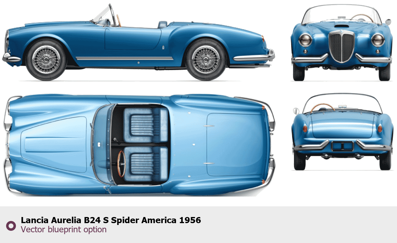 Raster blueprint of the 1956 Lancia Aurelia B24 S Spider America Roadster. This free downloadable image can be used for graphic projects, digital design, and 3D modeling. The file provides accurate exterior proportions of the vehicle. Model year: 1956. Body type: Roadster.