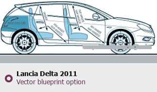 Raster blueprint of the 2011 Lancia Delta Hatchback. This free downloadable image can be used for graphic projects, digital design, and 3D modeling. The file provides accurate exterior proportions of the vehicle. Model year: 2011. Body type: Hatchback.