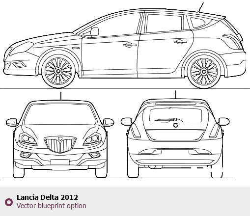 Raster blueprint of the 2012 Lancia Delta Hatchback. This free downloadable image can be used for graphic projects, digital design, and 3D modeling. The file provides accurate exterior proportions of the vehicle. Model year: 2012. Body type: Hatchback.