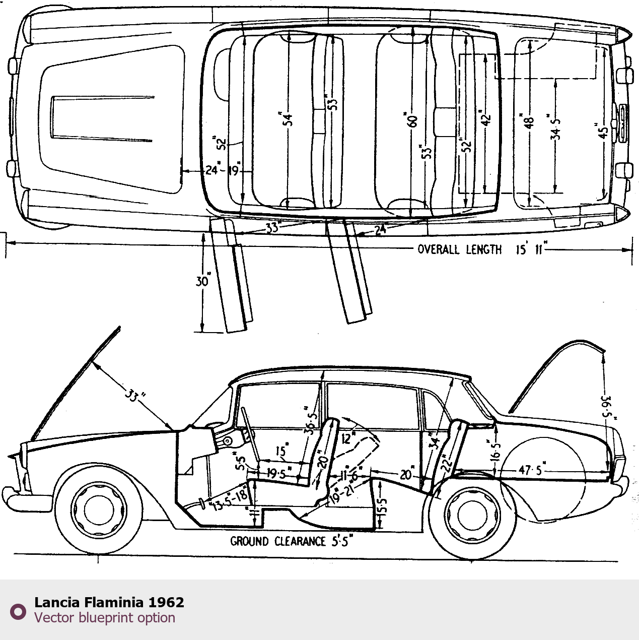 Raster blueprint of the 1962 Lancia Flaminia Tag. This free downloadable image can be used for graphic projects, digital design, and 3D modeling. The file provides accurate exterior proportions of the vehicle. Model year: 1962. Body type: Tag.