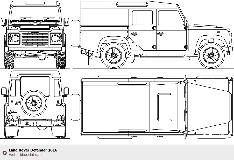 Raster blueprint of the 2016 Land Rover Defender SUV. This free downloadable image can be used for graphic projects, digital design, and 3D modeling. The file provides accurate exterior proportions of the vehicle. Model year: 2016. Body type: SUV.