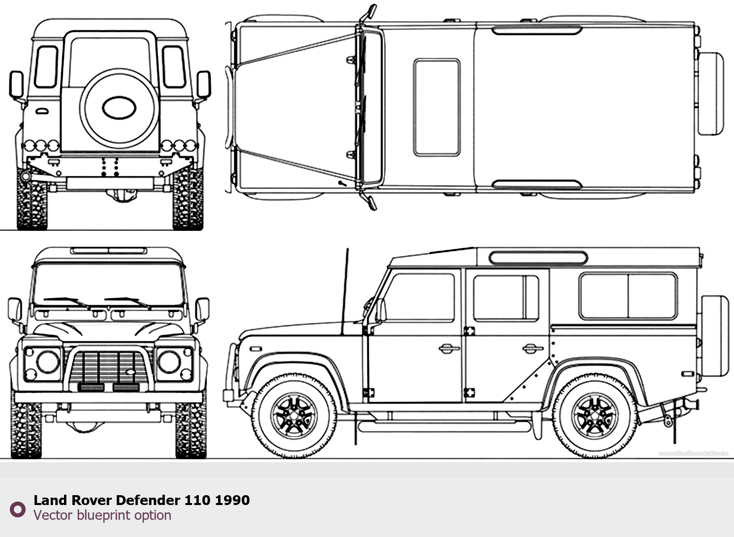 Raster blueprint of the 1990 Land Rover Defender 110 SUV. This free downloadable image can be used for graphic projects, digital design, and 3D modeling. The file provides accurate exterior proportions of the vehicle. Model year: 1990. Body type: SUV.