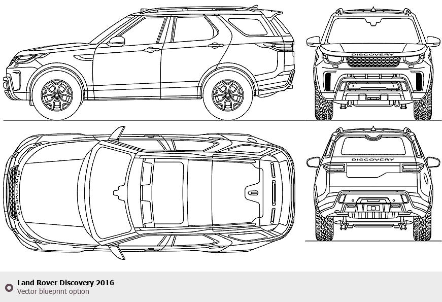 Raster blueprint of the 2016 Land Rover Discovery SUV. This free downloadable image can be used for graphic projects, digital design, and 3D modeling. The file provides accurate exterior proportions of the vehicle. Model year: 2016. Body type: SUV.