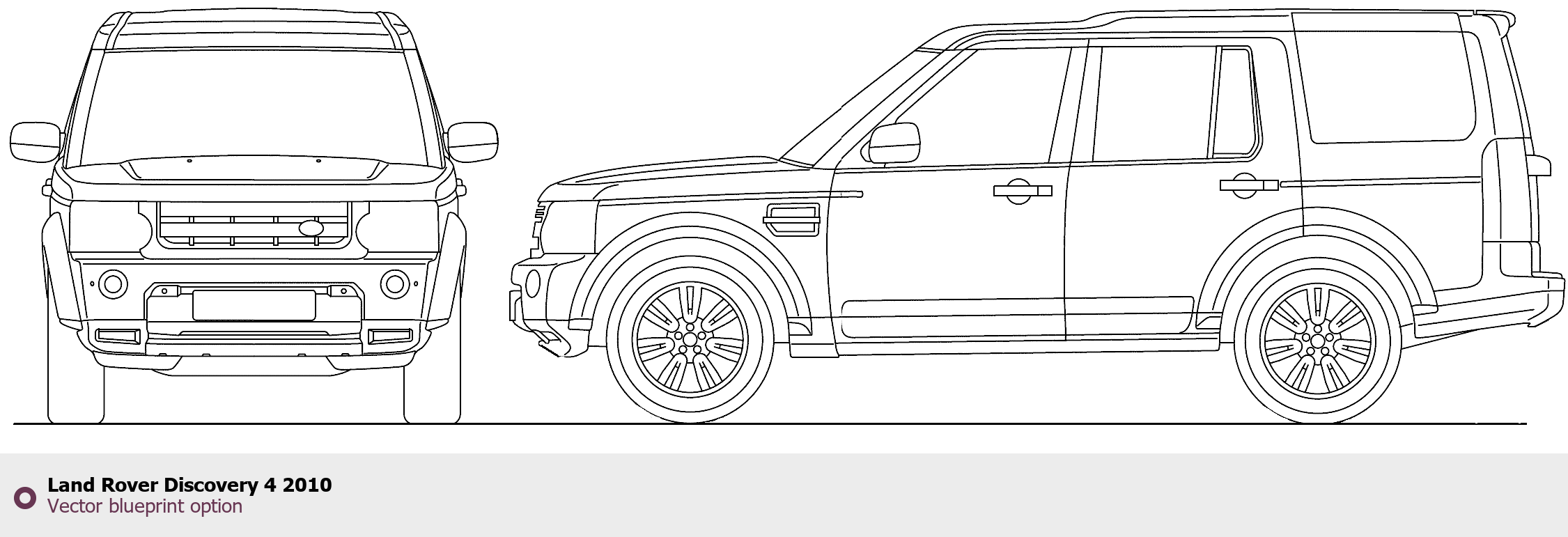 Raster blueprint of the 2010 Land Rover Discovery 4 SUV. This free downloadable image can be used for graphic projects, digital design, and 3D modeling. The file provides accurate exterior proportions of the vehicle. Model year: 2010. Body type: SUV.