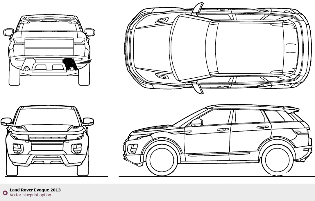 Raster blueprint of the 2013 Land Rover Evoque Tag. This free downloadable image can be used for graphic projects, digital design, and 3D modeling. The file provides accurate exterior proportions of the vehicle. Model year: 2013. Body type: Tag.