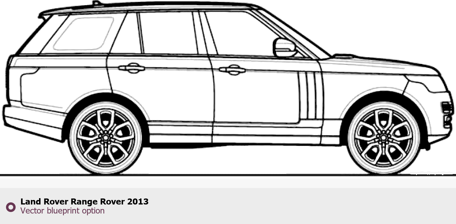 Raster blueprint of the 2013 Land Rover Range Rover SUV. This free downloadable image can be used for graphic projects, digital design, and 3D modeling. The file provides accurate exterior proportions of the vehicle. Model year: 2013. Body type: SUV.