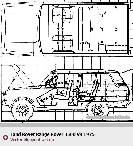 Raster blueprint of the 1975 Land Rover Range Rover 3500 V8 SUV. This free downloadable image can be used for graphic projects, digital design, and 3D modeling. The file provides accurate exterior proportions of the vehicle. Model year: 1975. Body type: SUV.