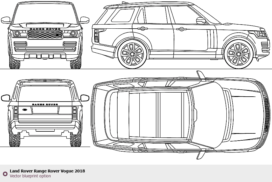 Raster blueprint of the 2018 Land Rover Range Rover Vogue SUV. This free downloadable image can be used for graphic projects, digital design, and 3D modeling. The file provides accurate exterior proportions of the vehicle. Model year: 2018. Body type: SUV.