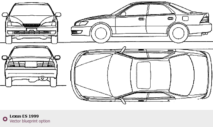 Raster blueprint of the 1999 Lexus ES Sedan. This free downloadable image can be used for graphic projects, digital design, and 3D modeling. The file provides accurate exterior proportions of the vehicle. Model year: 1999. Body type: Sedan.