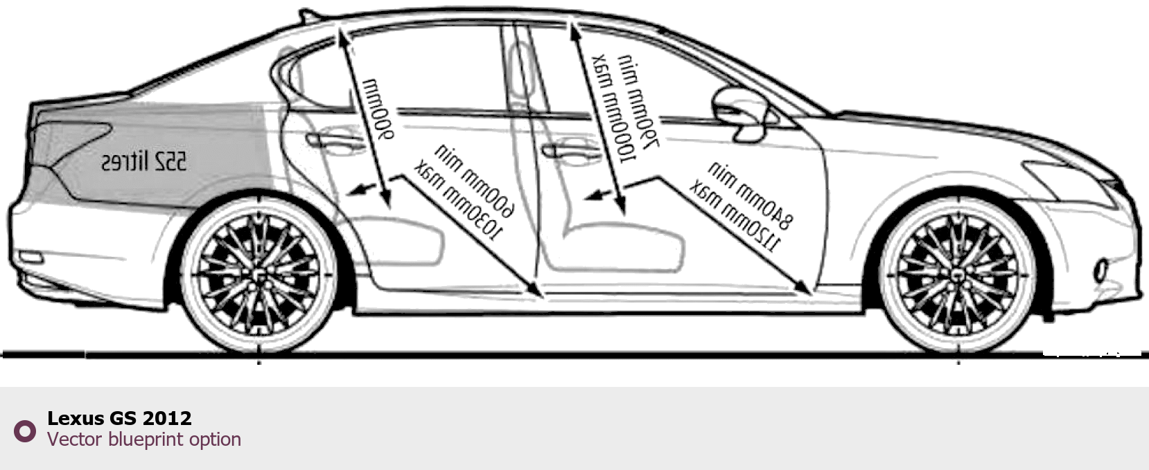 Raster blueprint of the 2012 Lexus GS Sedan. This free downloadable image can be used for graphic projects, digital design, and 3D modeling. The file provides accurate exterior proportions of the vehicle. Model year: 2012. Body type: Sedan.