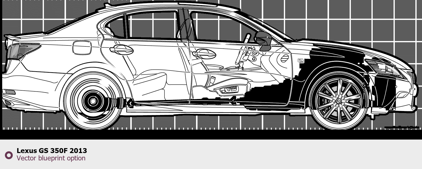 Raster blueprint of the 2013 Lexus GS 350F Sedan. This free downloadable image can be used for graphic projects, digital design, and 3D modeling. The file provides accurate exterior proportions of the vehicle. Model year: 2013. Body type: Sedan.