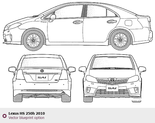 Raster blueprint of the 2010 Lexus HS 250h Tag. This free downloadable image can be used for graphic projects, digital design, and 3D modeling. The file provides accurate exterior proportions of the vehicle. Model year: 2010. Body type: Tag.