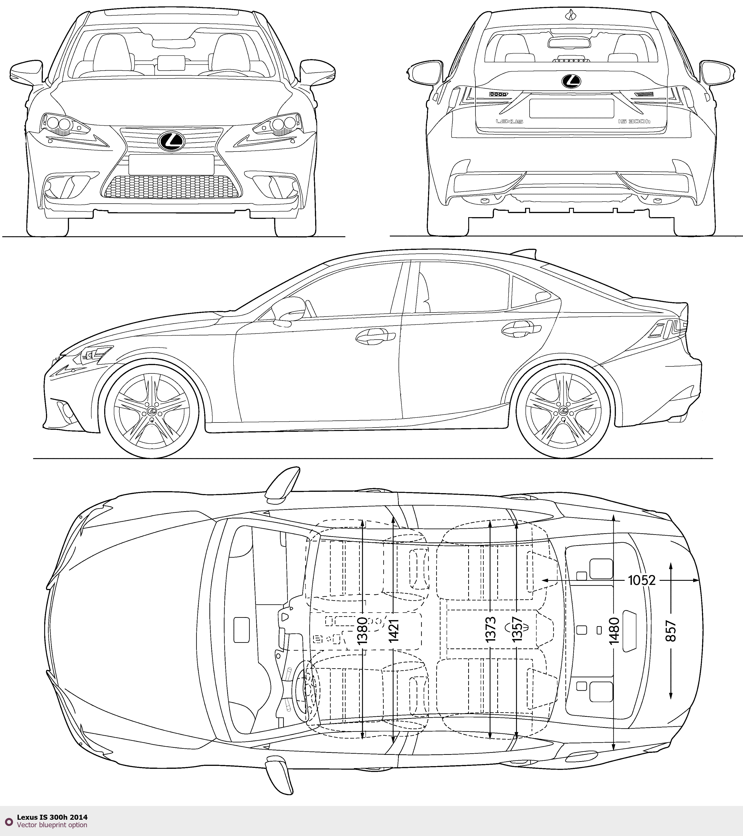 Raster blueprint of the 2014 Lexus IS 300h Tag. This free downloadable image can be used for graphic projects, digital design, and 3D modeling. The file provides accurate exterior proportions of the vehicle. Model year: 2014. Body type: Tag.