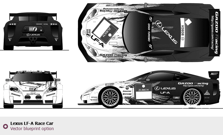 Raster blueprint of the Lexus LF-A Race Car Tag. This free downloadable image can be used for graphic projects, digital design, and 3D modeling. The file provides accurate exterior proportions of the vehicle. Body type: Tag.