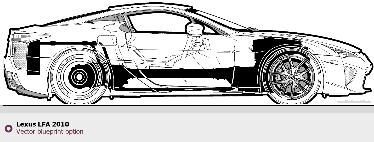 Raster blueprint of the 2010 Lexus LFA Tag. This free downloadable image can be used for graphic projects, digital design, and 3D modeling. The file provides accurate exterior proportions of the vehicle. Model year: 2010. Body type: Tag.