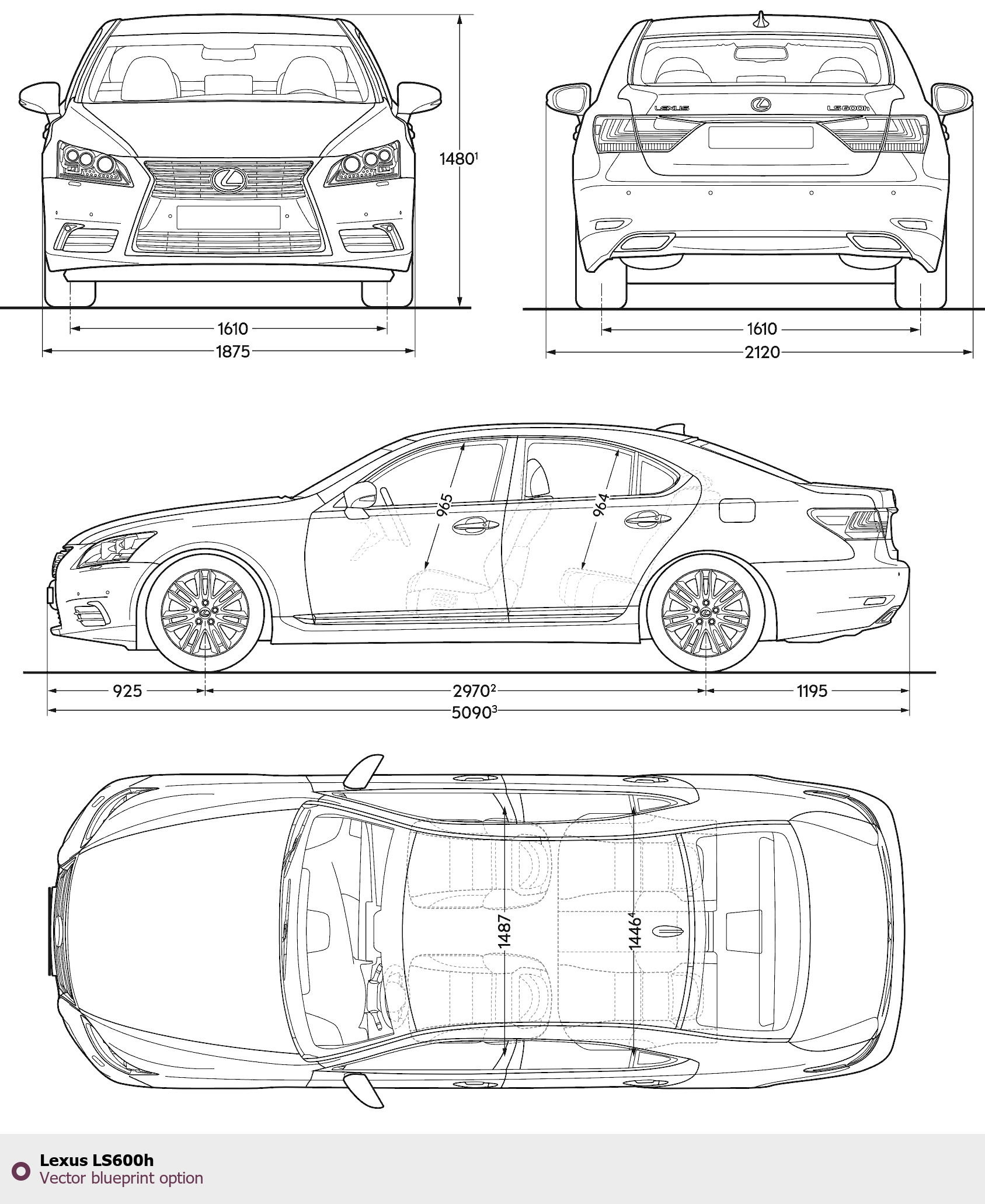Raster blueprint of the Lexus LS600h Sedan. This free downloadable image can be used for graphic projects, digital design, and 3D modeling. The file provides accurate exterior proportions of the vehicle. Body type: Sedan.