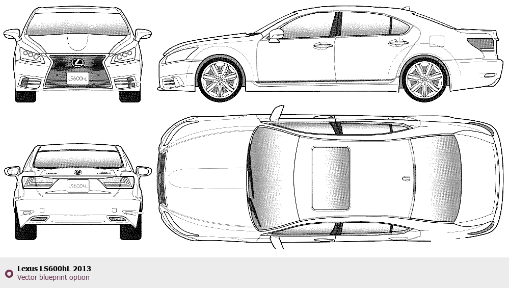 Raster blueprint of the 2013 Lexus LS600hL Sedan. This free downloadable image can be used for graphic projects, digital design, and 3D modeling. The file provides accurate exterior proportions of the vehicle. Model year: 2013. Body type: Sedan.