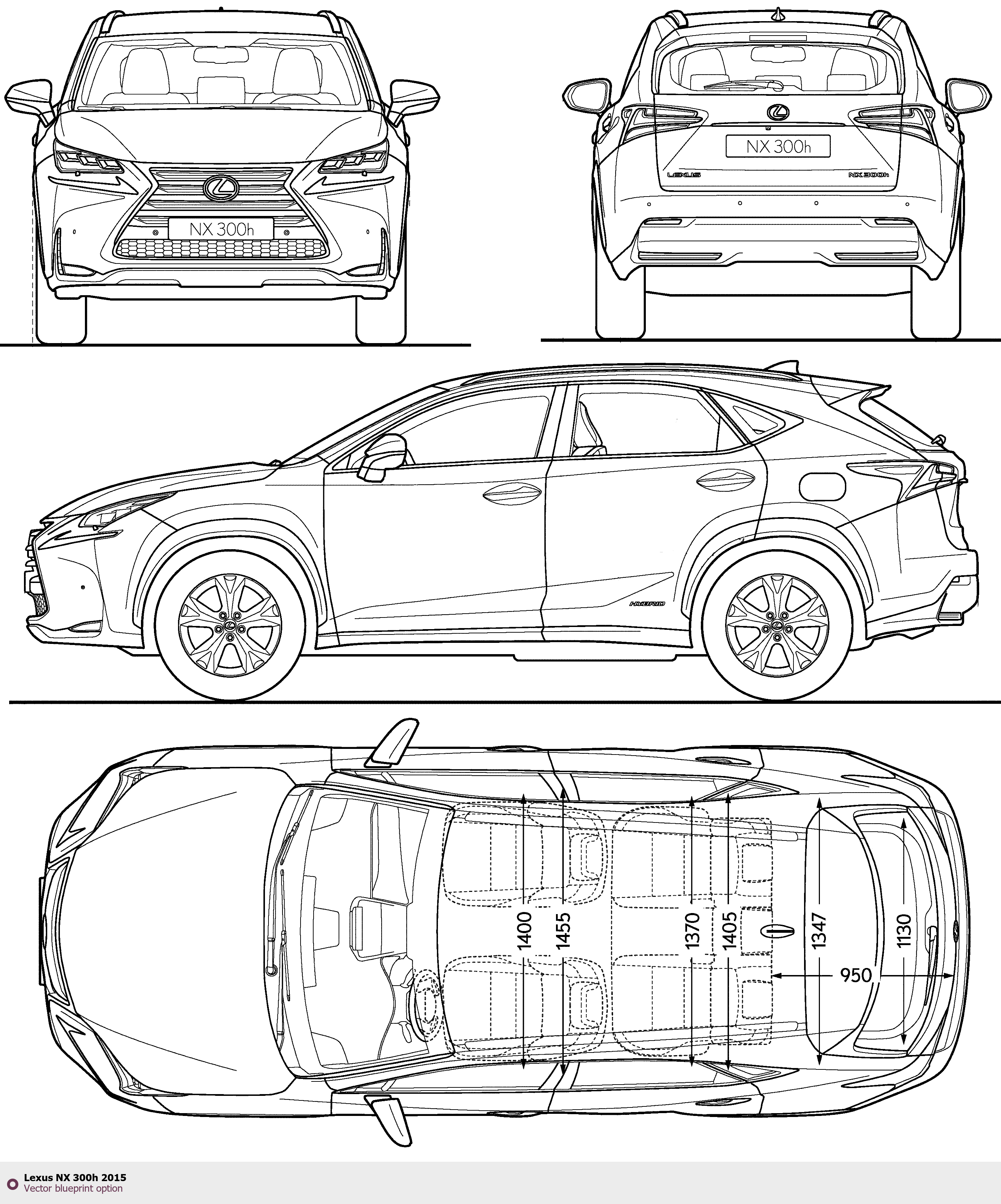 Raster blueprint of the 2015 Lexus NX 300h SUV. This free downloadable image can be used for graphic projects, digital design, and 3D modeling. The file provides accurate exterior proportions of the vehicle. Model year: 2015. Body type: SUV.