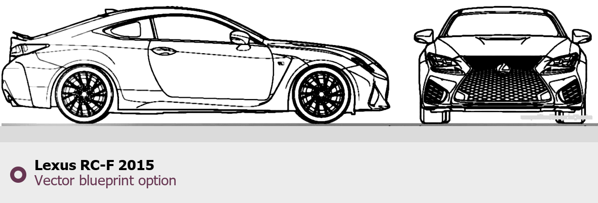 Raster blueprint of the 2015 Lexus RC-F Coupe. This free downloadable image can be used for graphic projects, digital design, and 3D modeling. The file provides accurate exterior proportions of the vehicle. Model year: 2015. Body type: Coupe.