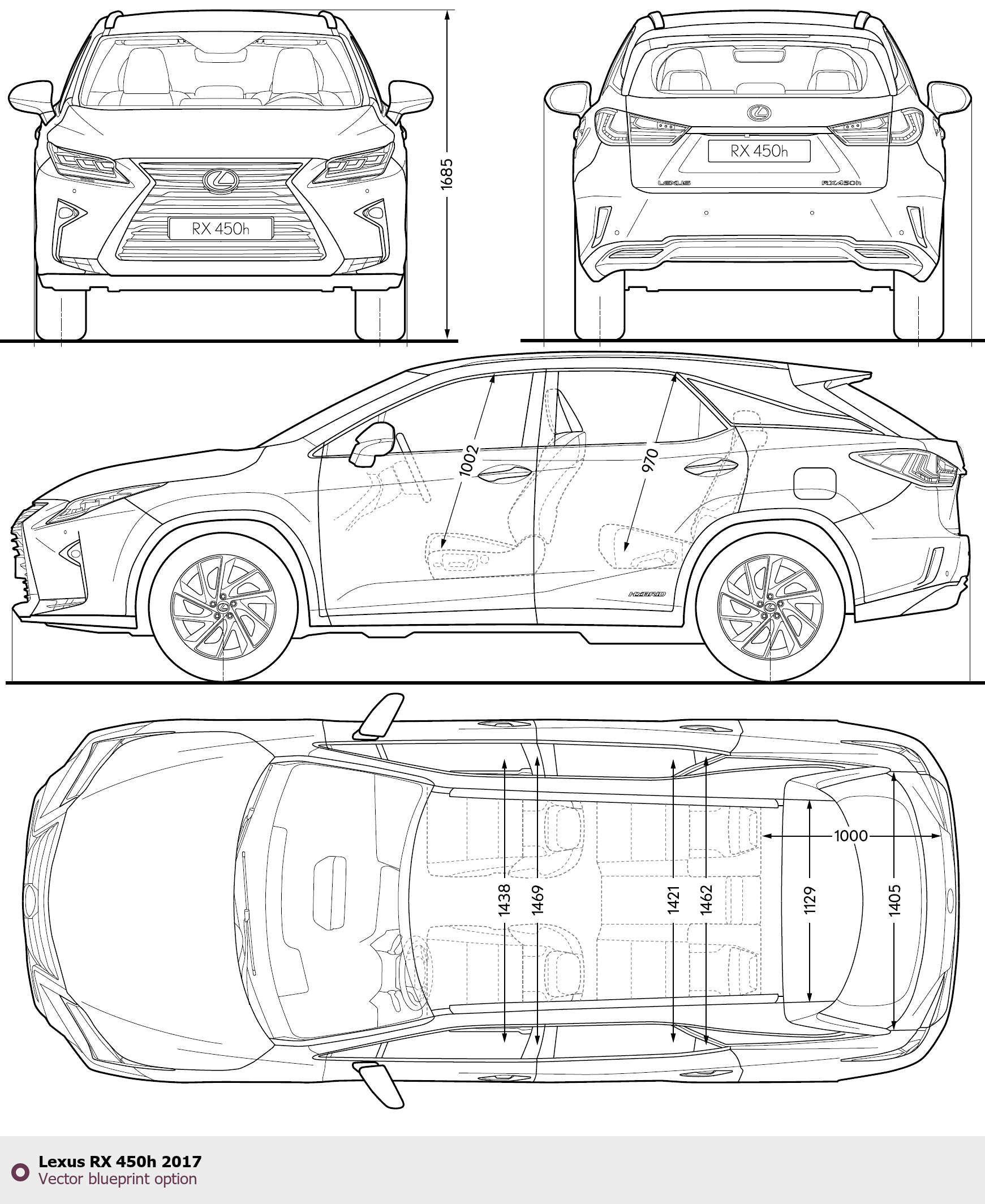 Raster blueprint of the 2017 Lexus RX 450h SUV. This free downloadable image can be used for graphic projects, digital design, and 3D modeling. The file provides accurate exterior proportions of the vehicle. Model year: 2017. Body type: SUV.