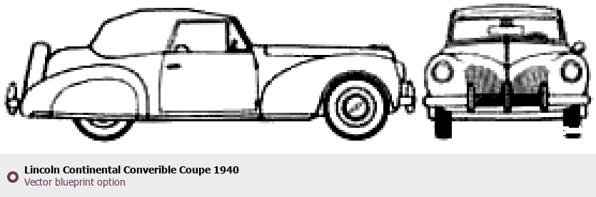 Raster blueprint of the 1940 Lincoln Continental Converible Coupe Coupe. This free downloadable image can be used for graphic projects, digital design, and 3D modeling. The file provides accurate exterior proportions of the vehicle. Model year: 1940. Body type: Coupe.