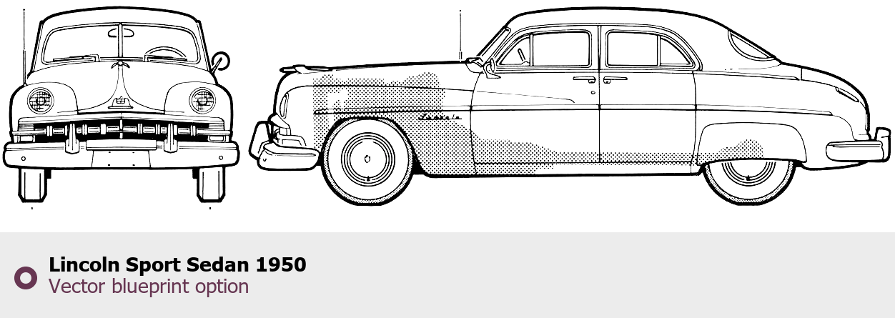 Raster blueprint of the 1950 Lincoln Sport Sedan Sedan. This free downloadable image can be used for graphic projects, digital design, and 3D modeling. The file provides accurate exterior proportions of the vehicle. Model year: 1950. Body type: Sedan.