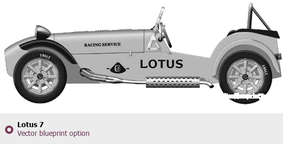 Raster blueprint of the Lotus 7 Tag. This free downloadable image can be used for graphic projects, digital design, and 3D modeling. The file provides accurate exterior proportions of the vehicle. Body type: Tag.