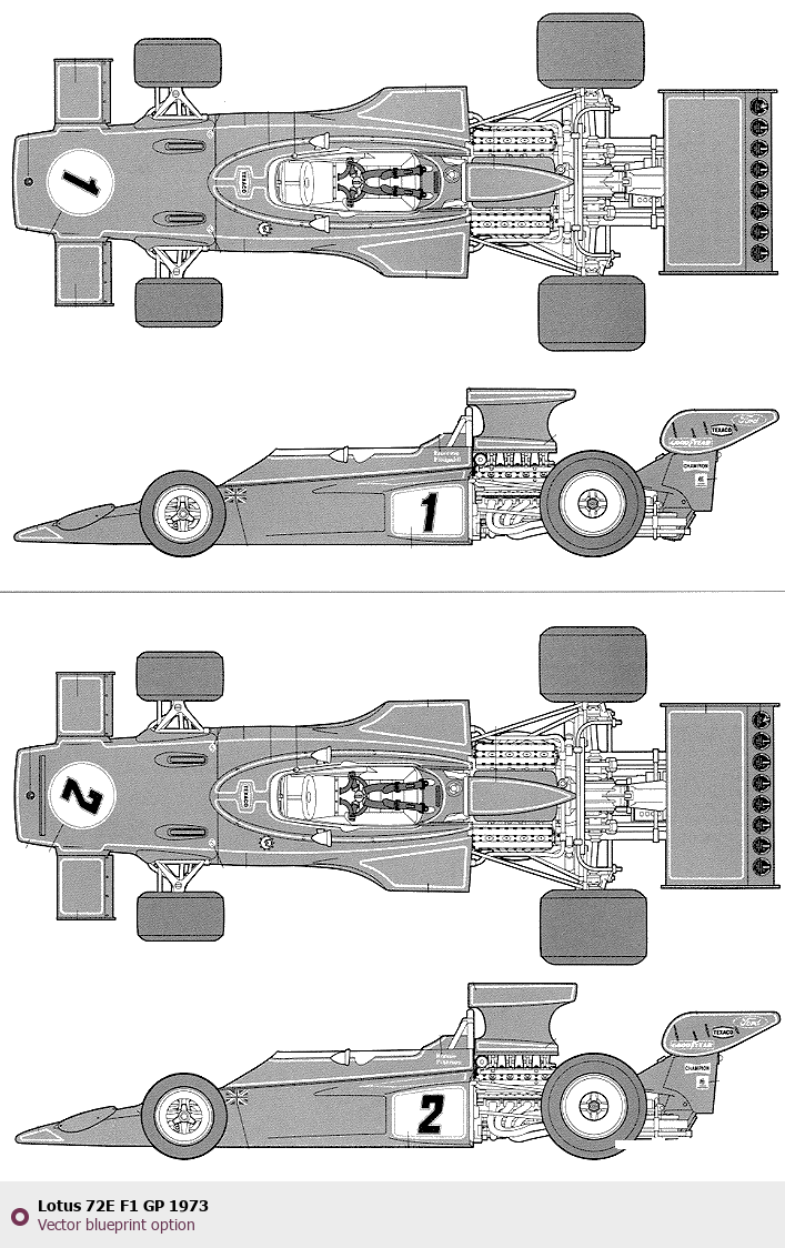 Raster blueprint of the 1973 Lotus 72E F1 GP Formula. This free downloadable image can be used for graphic projects, digital design, and 3D modeling. The file provides accurate exterior proportions of the vehicle. Model year: 1973. Body type: Formula.