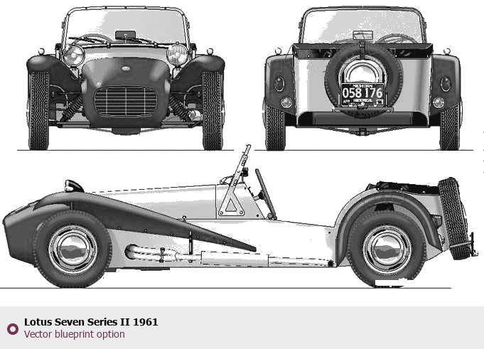 Raster blueprint of the 1961 Lotus Seven Series II Tag. This free downloadable image can be used for graphic projects, digital design, and 3D modeling. The file provides accurate exterior proportions of the vehicle. Model year: 1961. Body type: Tag.