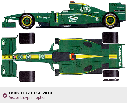 Raster blueprint of the 2010 Lotus T127 F1 GP Formula. This free downloadable image can be used for graphic projects, digital design, and 3D modeling. The file provides accurate exterior proportions of the vehicle. Model year: 2010. Body type: Formula.
