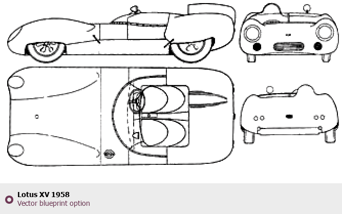 Raster blueprint of the 1958 Lotus XV Tag. This free downloadable image can be used for graphic projects, digital design, and 3D modeling. The file provides accurate exterior proportions of the vehicle. Model year: 1958. Body type: Tag.