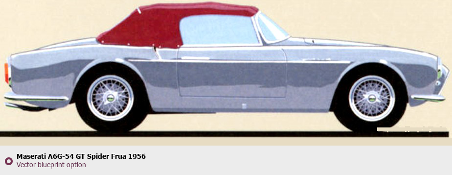 Raster blueprint of the 1956 Maserati A6G-54 GT Spider Frua Roadster. This free downloadable image can be used for graphic projects, digital design, and 3D modeling. The file provides accurate exterior proportions of the vehicle. Model year: 1956. Body type: Roadster.