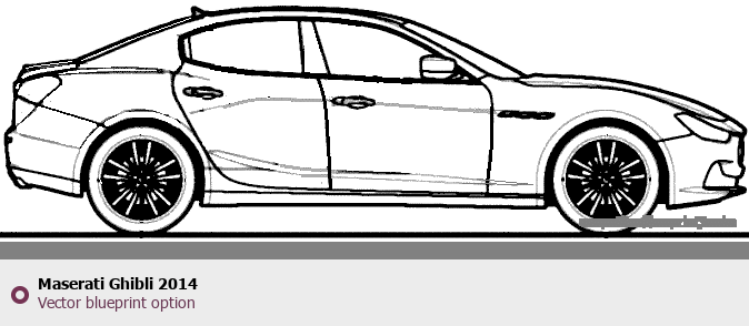 Raster blueprint of the 2014 Maserati Ghibli Tag. This free downloadable image can be used for graphic projects, digital design, and 3D modeling. The file provides accurate exterior proportions of the vehicle. Model year: 2014. Body type: Tag.
