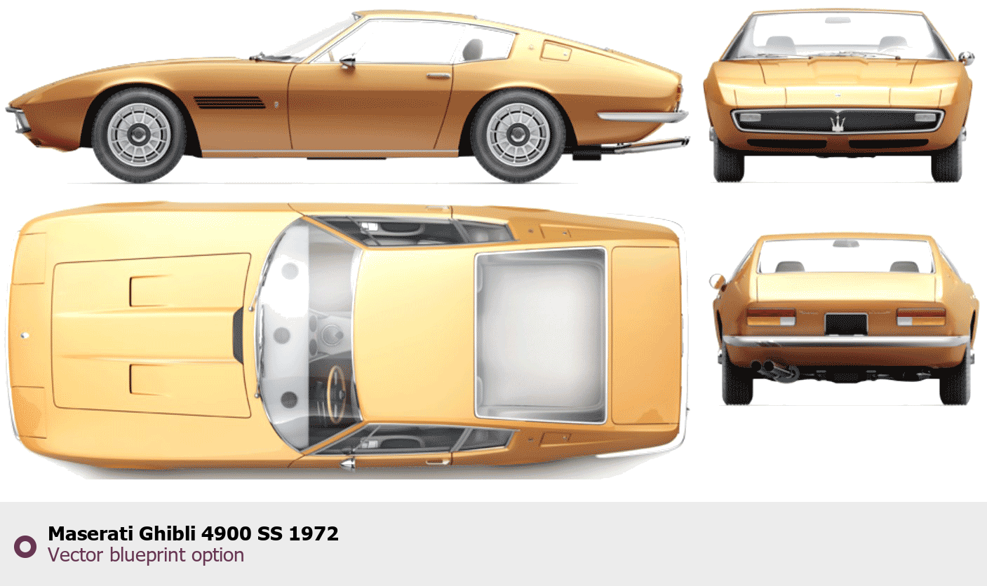 Raster blueprint of the 1972 Maserati Ghibli 4900 SS Tag. This free downloadable image can be used for graphic projects, digital design, and 3D modeling. The file provides accurate exterior proportions of the vehicle. Model year: 1972. Body type: Tag.