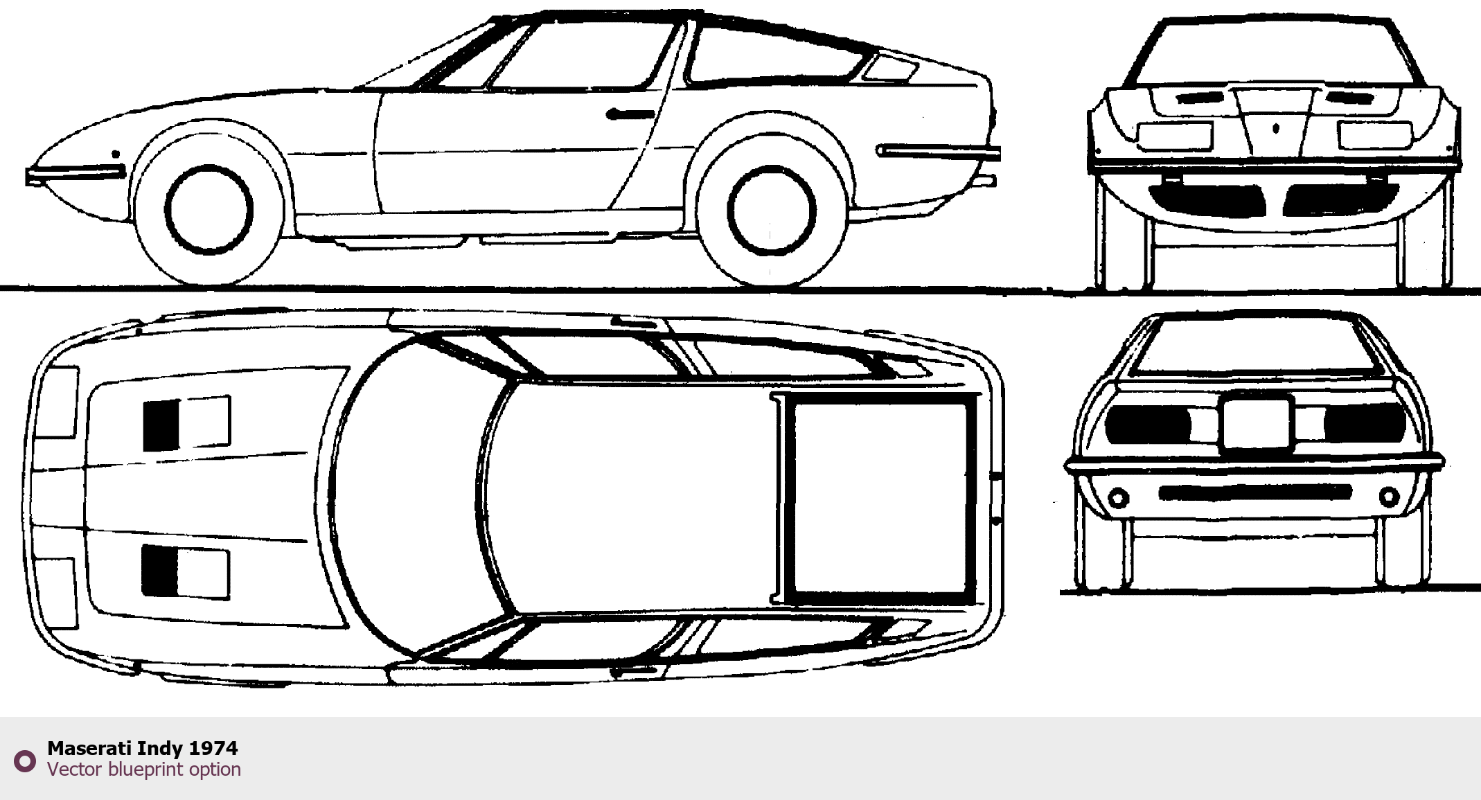 Raster blueprint of the 1974 Maserati Indy Tag. This free downloadable image can be used for graphic projects, digital design, and 3D modeling. The file provides accurate exterior proportions of the vehicle. Model year: 1974. Body type: Tag.