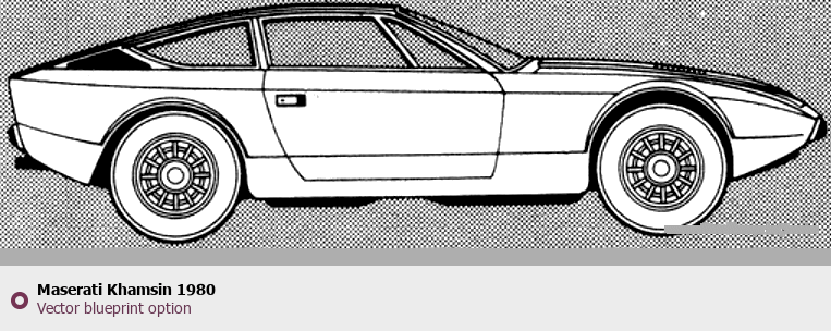 Raster blueprint of the 1980 Maserati Khamsin Tag. This free downloadable image can be used for graphic projects, digital design, and 3D modeling. The file provides accurate exterior proportions of the vehicle. Model year: 1980. Body type: Tag.