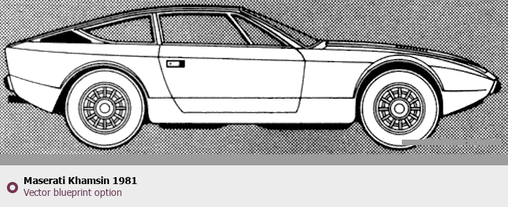 Raster blueprint of the 1981 Maserati Khamsin Tag. This free downloadable image can be used for graphic projects, digital design, and 3D modeling. The file provides accurate exterior proportions of the vehicle. Model year: 1981. Body type: Tag.
