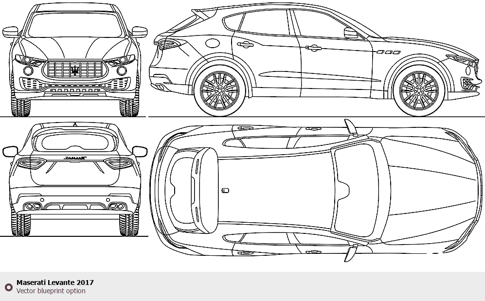 Raster blueprint of the 2017 Maserati Levante SUV. This free downloadable image can be used for graphic projects, digital design, and 3D modeling. The file provides accurate exterior proportions of the vehicle. Model year: 2017. Body type: SUV.