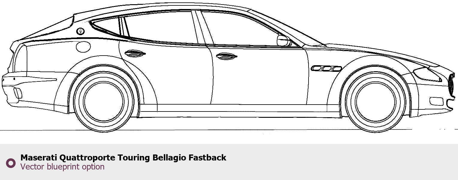 Raster blueprint of the Maserati Quattroporte Touring Bellagio Fastback Sedan. This free downloadable image can be used for graphic projects, digital design, and 3D modeling. The file provides accurate exterior proportions of the vehicle. Body type: Sedan.