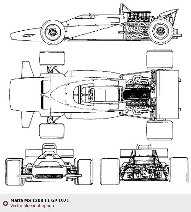 Raster blueprint of the 1971 Matra MS 120B F1 GP Formula. This free downloadable image can be used for graphic projects, digital design, and 3D modeling. The file provides accurate exterior proportions of the vehicle. Model year: 1971. Body type: Formula.