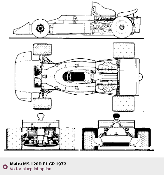 Raster blueprint of the 1972 Matra MS 120D F1 GP Formula. This free downloadable image can be used for graphic projects, digital design, and 3D modeling. The file provides accurate exterior proportions of the vehicle. Model year: 1972. Body type: Formula.