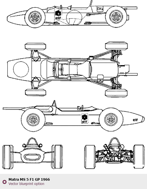 Raster blueprint of the 1966 Matra MS 5 F1 GP Formula. This free downloadable image can be used for graphic projects, digital design, and 3D modeling. The file provides accurate exterior proportions of the vehicle. Model year: 1966. Body type: Formula.
