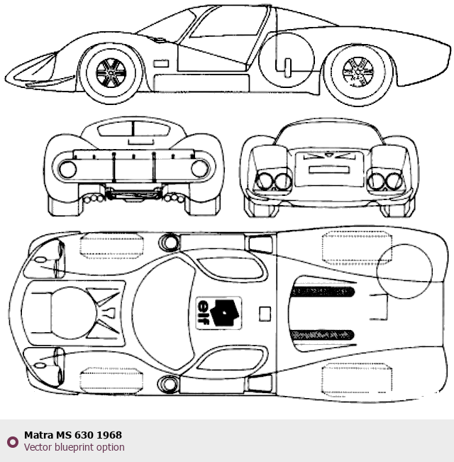 Raster blueprint of the 1968 Matra MS 630 Coupe. This free downloadable image can be used for graphic projects, digital design, and 3D modeling. The file provides accurate exterior proportions of the vehicle. Model year: 1968. Body type: Coupe.