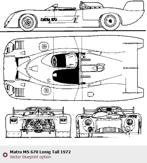 Raster blueprint of the 1972 Matra MS 670 Lomg Tail Coupe. This free downloadable image can be used for graphic projects, digital design, and 3D modeling. The file provides accurate exterior proportions of the vehicle. Model year: 1972. Body type: Coupe.