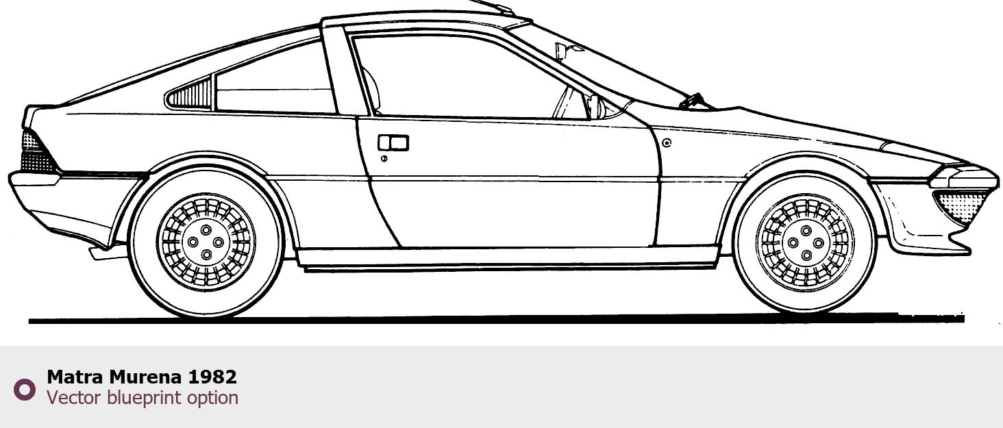 Raster blueprint of the 1982 Matra Murena Coupe. This free downloadable image can be used for graphic projects, digital design, and 3D modeling. The file provides accurate exterior proportions of the vehicle. Model year: 1982. Body type: Coupe.